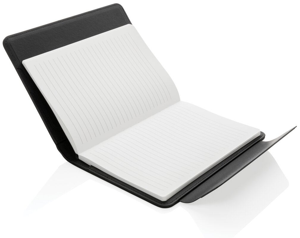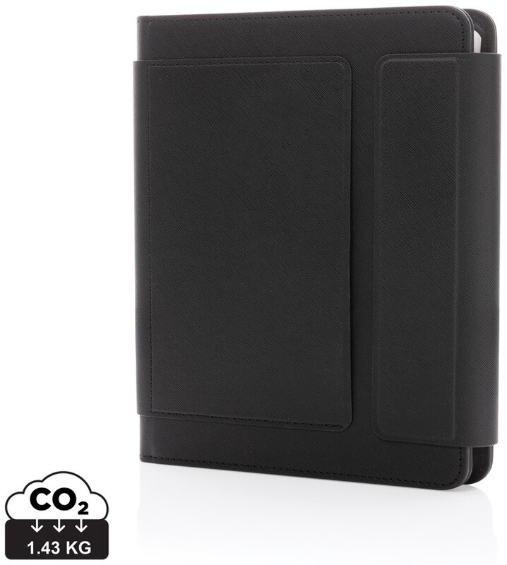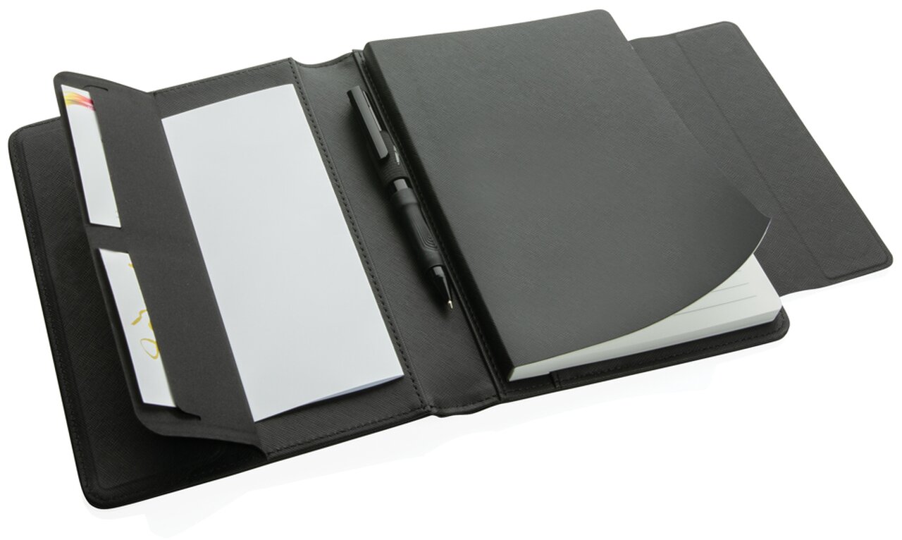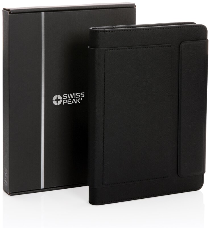 Portfolio A5 z kolekce Swiss Peak Heritage, která mluví jazykem moderní elegance. Produkt obsahuje 2 sloty na vizitky nebo karty, poutko na pera a prostor na zápisník. Zápisník je vyroben z kamenného linkovaného papíru s 64 listy/128 stranami. Obal portfolia je vyroben z ikonické italské recyklované PU kůže s RCS certifikací. Celkový podíl recyklátu dle váhy produktu: 14 %. Bez PVC.