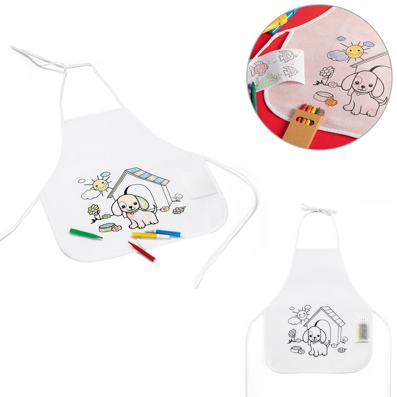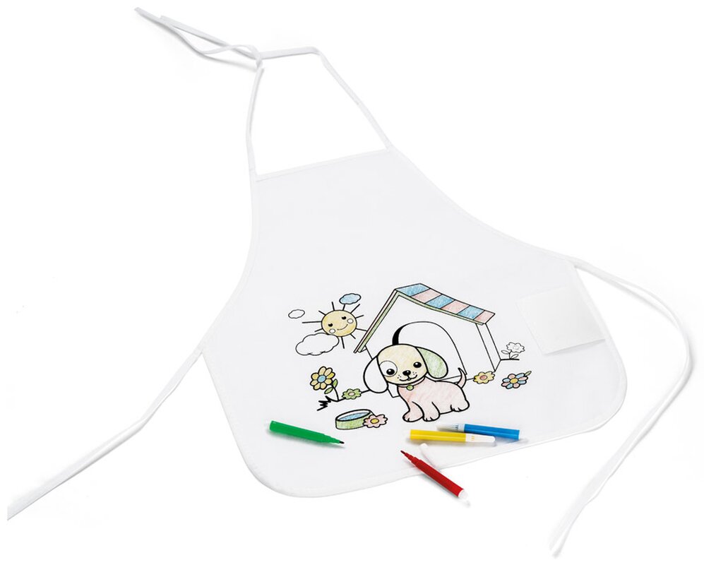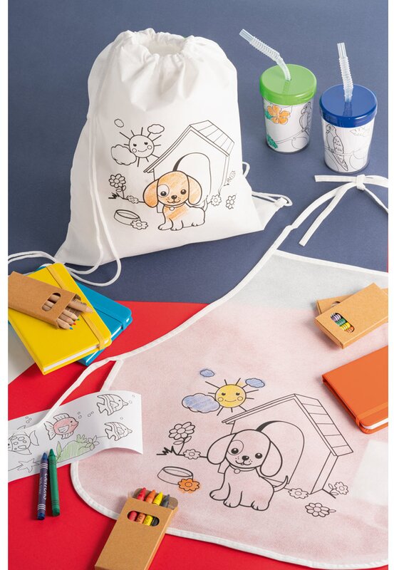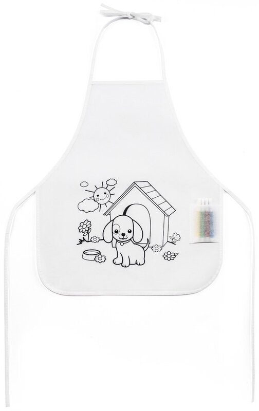 Dětská kuchyňská zástěra NILO z netkané textilie (80 g/m²). Obrázek se dá vymalovat fixy, které jsou součástí balení. Postranní kapsa a klasický způsob zavazování.
