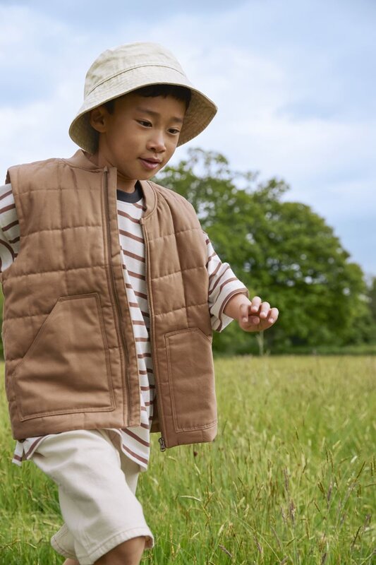 Dětský klobouk ve vintage stylu je ideální volbou pro letní dny a pobyt venku. Šikmá krempa s ozdobným prošíváním poskytuje ochranu před sluncem a zároveň dodává klobouku stylový vzhled. Obšité větrací otvory zajišťují lepší prodyšnost a pohodlí při nošení.