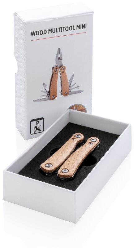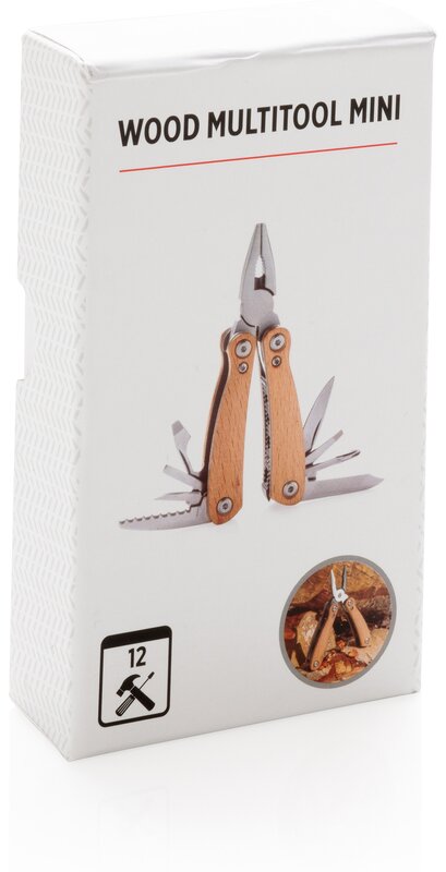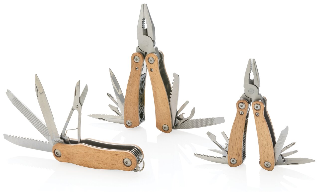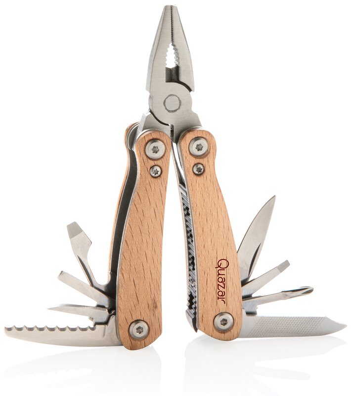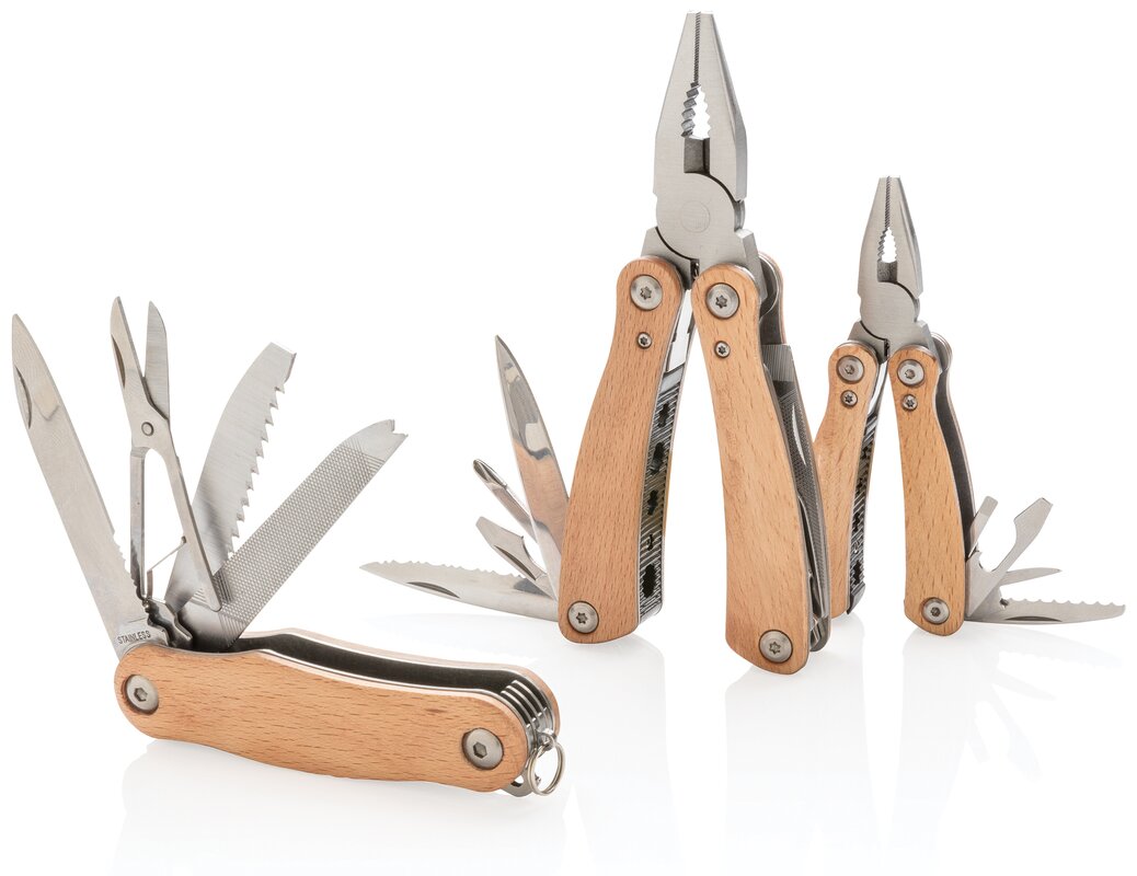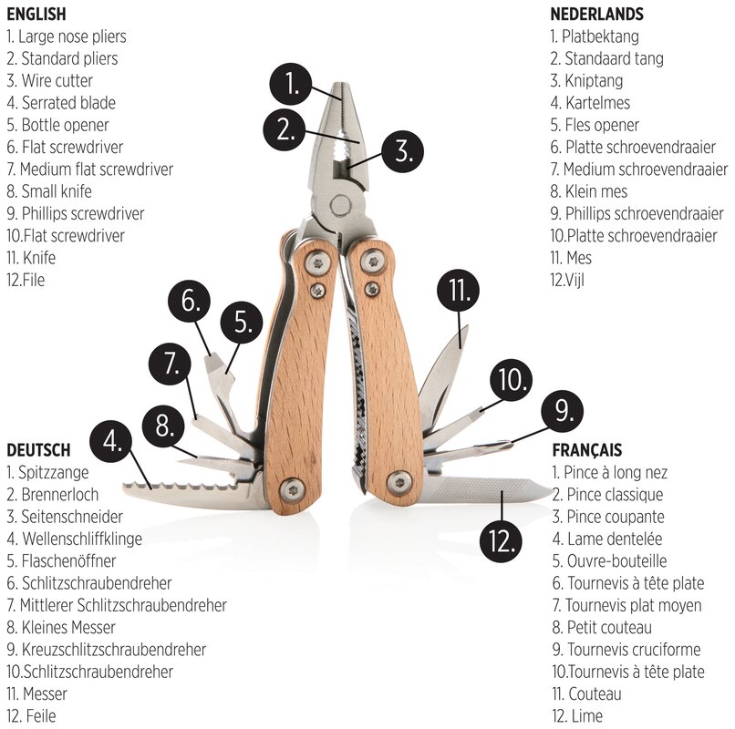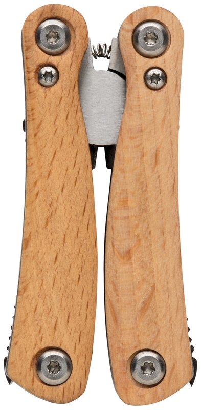 Kvalitní odolný multifunkční nůž s 12 funkcemi: kleště s jehlovou špičkou, utahovací kleště, štípací kleště, malý a standardní nůž s rovným ostřím, nůž se zubatým ostřím, křížový šroubovák, střední a velký plochý šroubovák, pilka, otvírák lahví, pilník. Tělo ze dřeva, nástroje z prvotřídní nerezové oceli. Baleno v dárkové krabičce.