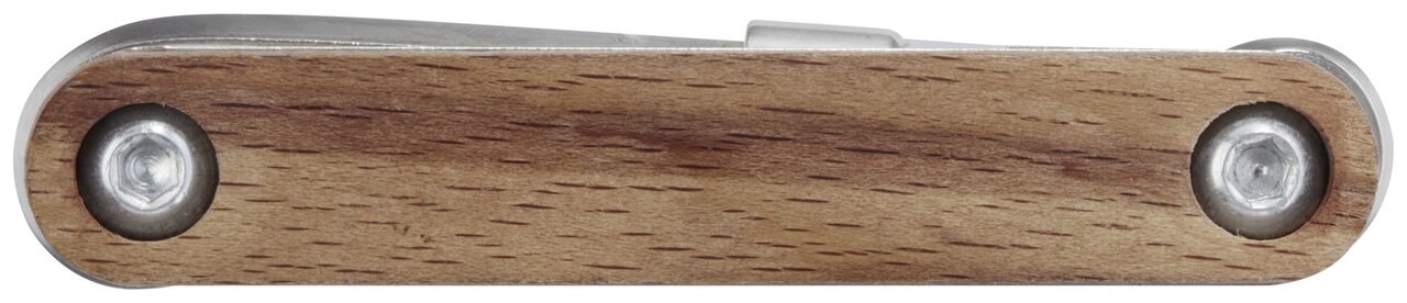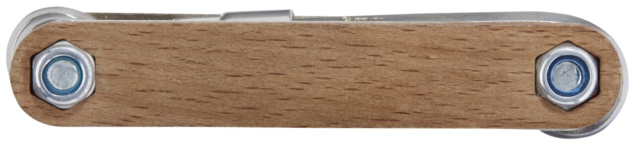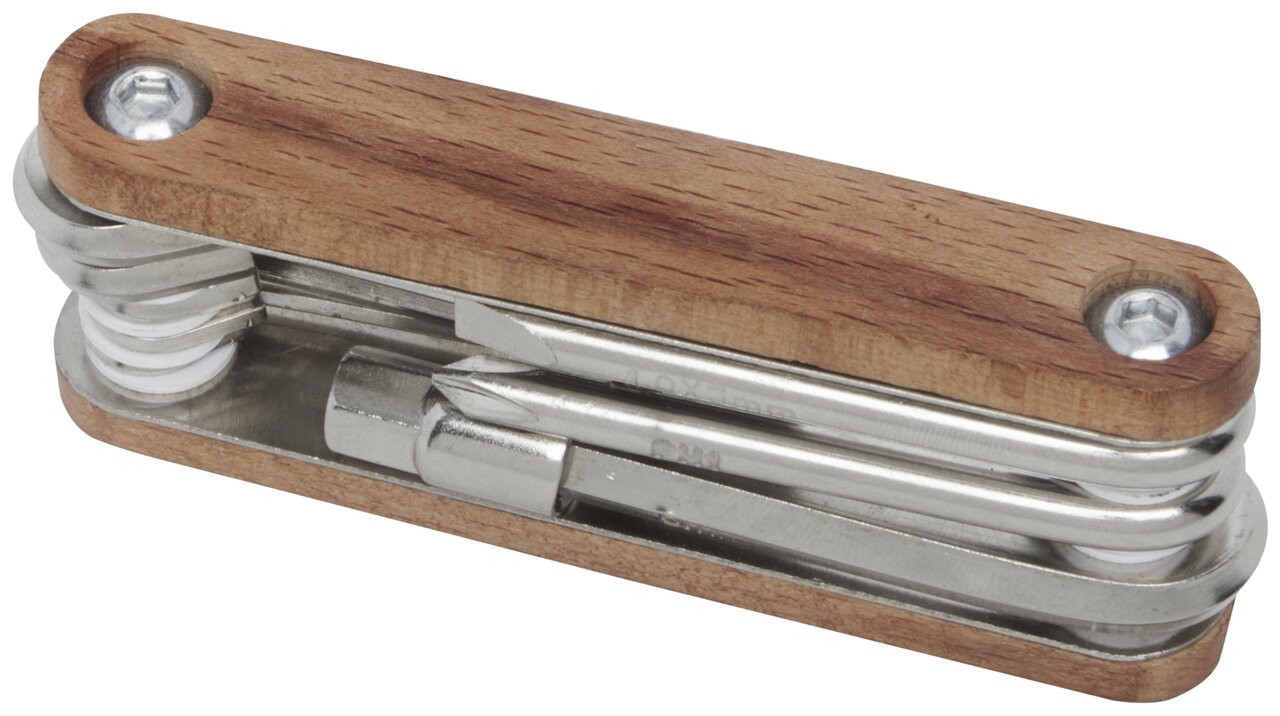 Silný a odolný kompaktní multifunkční nástroj na kolo vyrobený z vysoce kvalitní nerezové oceli s rukojetí z bukového dřeva. Bez tohoto nástroje se v případě potřeby neočekávané rychlé opravy neobejde žádný milovník jízdních kol. Obsahuje 8 základních nástrojů pro jízdní kola: imbusový klíč (2 mm / 2,5 mm / 3 mm / 4 mm / 5 mm / 5,5 mm / 6 mm), šroubovák Phillips a plochý šroubovák. Velikost při otevření je 19,5 x 3,6 cm a při zavření 9,6 x 3,6 cm. Laserové gravírování se doporučuje jako možnost udržitelné dekorace.