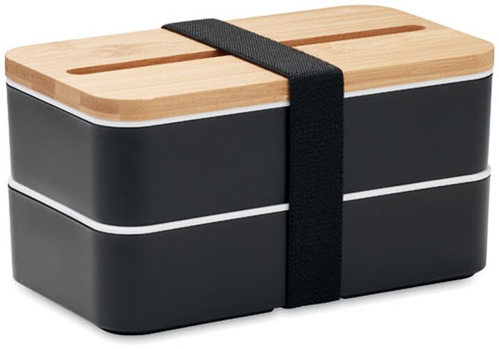 Dvoupatrový box na svačinu z recyklovaného PP s odnímatelnou přepážkou a 3 příbory. Zavírání pomocí pásky. Bambusové víko slouží i jako stojánek na telefon. Objem: 400 ml (2x). Bambus je přírodní materiál, může dojít k mírným změnám barvy, dekorace a velikosti. Neteče.