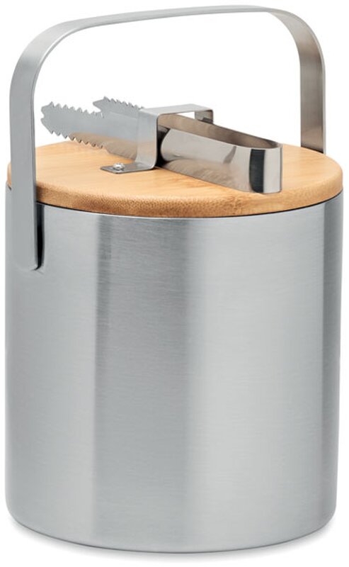 Dvoustěnný izolovaný kbelík na led z nerezové oceli s bambusovým víkem a kleštěmi na led. Objem: 1200 ml.