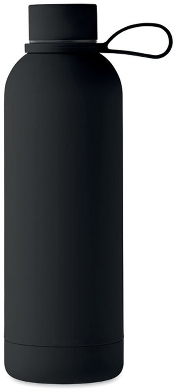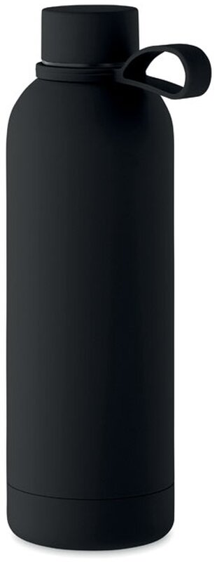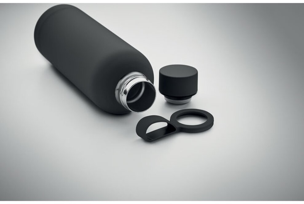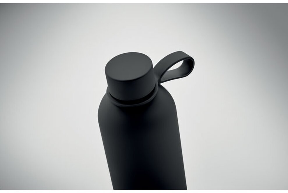 Dvoustěnná izolační láhev z recyklované nerezové oceli (90 % recyklované nerezové oceli a 10 % nerezové oceli) s pogumovanou povrchovou úpravou a silikonovým poutkem. Objem: 500 ml.