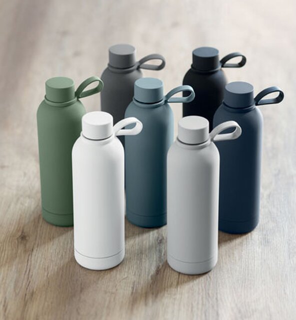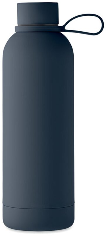 Dvoustěnná izolační láhev z recyklované nerezové oceli (90 % recyklované nerezové oceli a 10 % nerezové oceli) s pogumovanou povrchovou úpravou a silikonovým poutkem. Objem: 500 ml.
