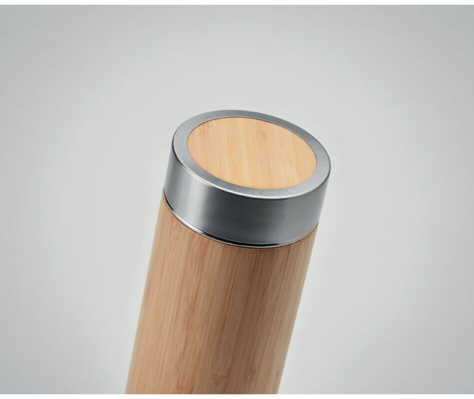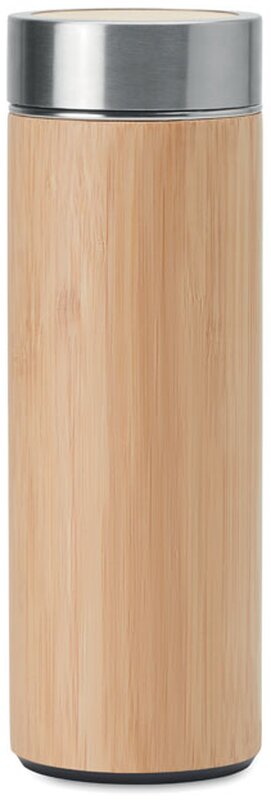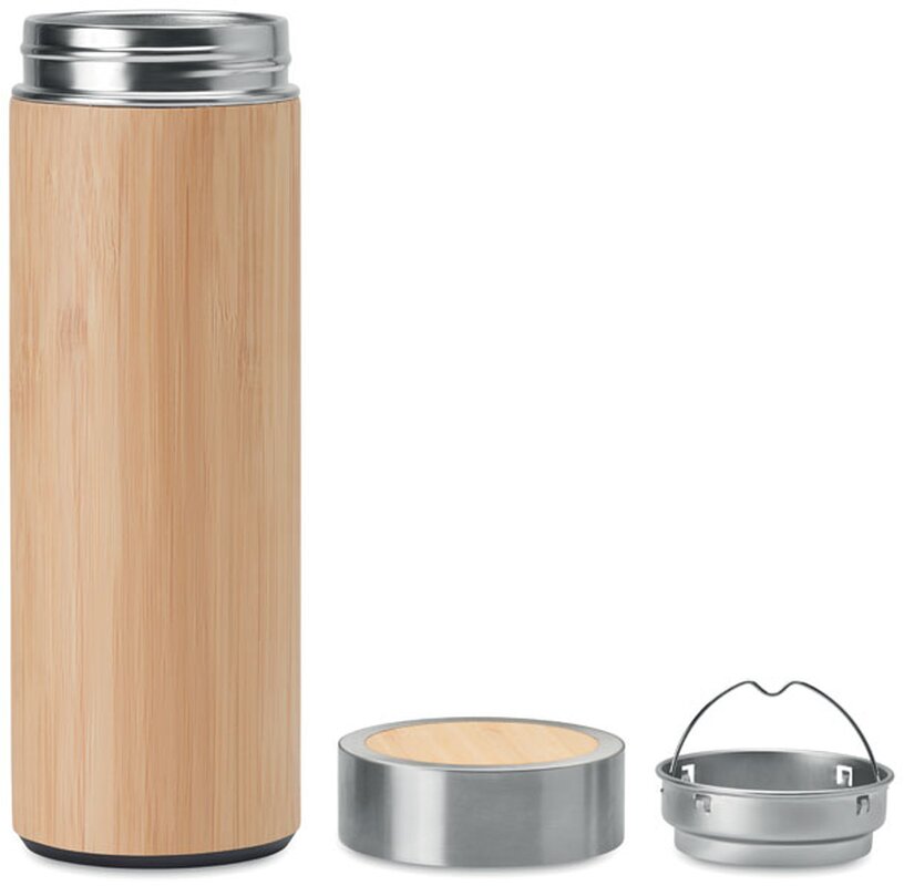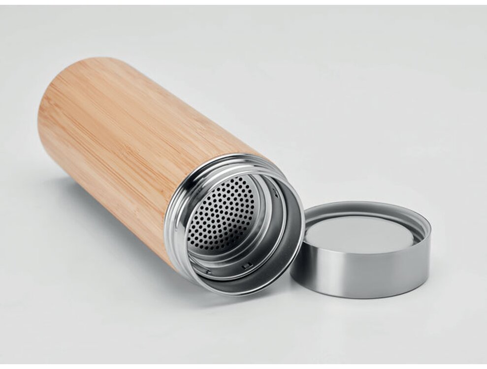 Dvoustěnná nerezová láhev s bambusovým povrchem a izolačním vakuem. Objem lahve je 400 ml. K lahvi je i přídavný čajový infuzer.