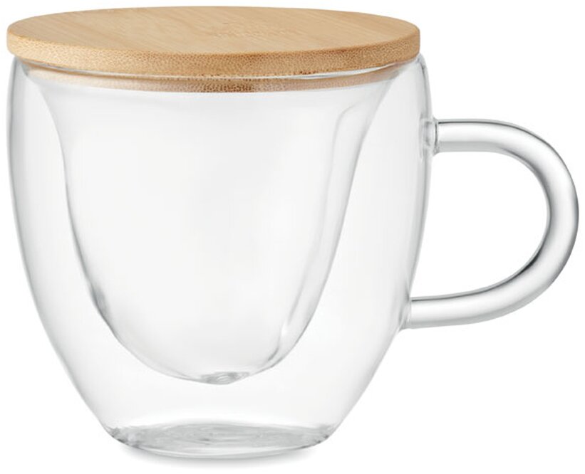 Dvoustěnný hrnek CORAMUG z borosilikátového skla do tvaru srdce. Součástí je bambusové víčko. Bambus je přírodní materiál, může dojít k mírným změnám barvy, dekorace a velikosti. Objem: 180 ml.