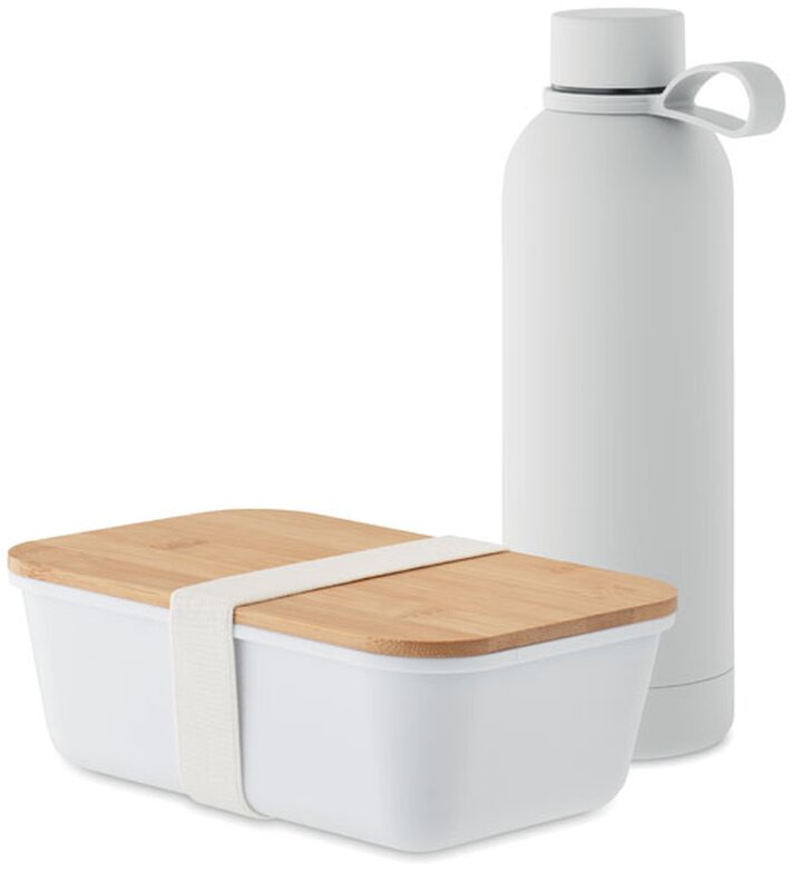 2dílná dárková obědová sada. Obsahuje láhev s dvojitou stěnou z recyklované nerezové oceli (90 % recyklovaná nerezová ocel a 10 % nerezové oceli) a krabičku na oběd (svačinový box) z recyklovaného PP s bambusovým víkem a elastickým pásem z RPET. Objem 500 ml a 900 ml.