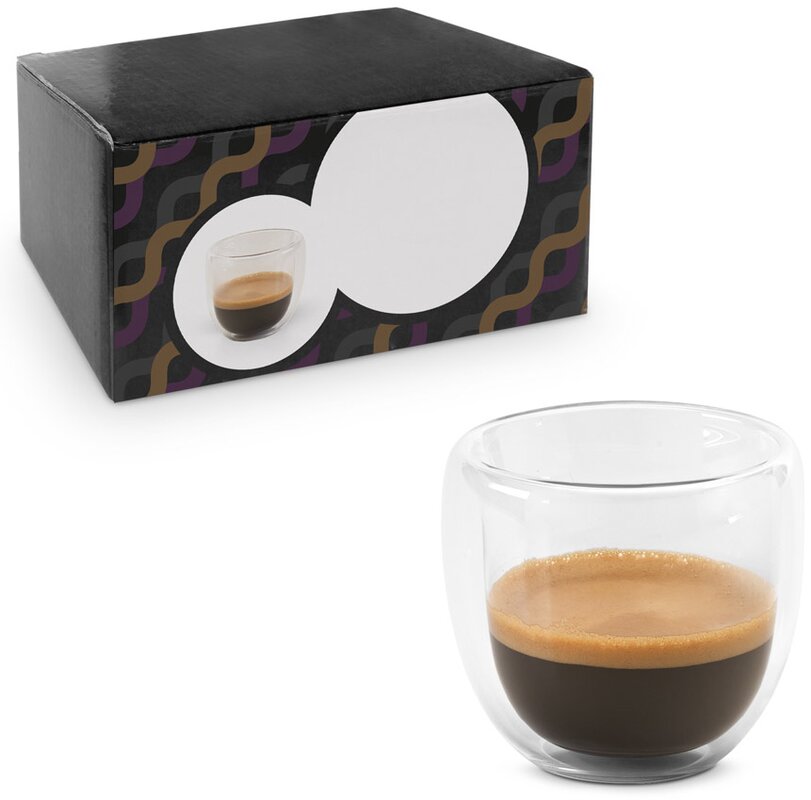 Skleněná sada na kávu. Sada obsahuje 2 dvouplášťové izotermické šálky o objemu 90 ml. Výrobek se dodává v dárkové krabičce.
