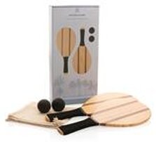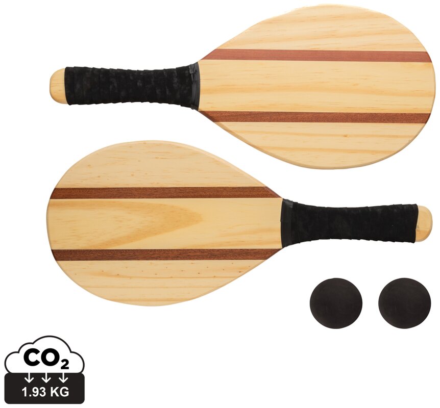 Luxusní letní sada na hraní frescobol tenisu. Prodkut obsahuje 2 frescobolové tenisové rakety. Součástí jsou i 2 vysoce kvalitní míčky, včetně bavlněného pytlíku pro snadný přenos. Výrobek je z pevného a odolného borovicového dřeva v kombinaci s dřevem Sapele. Díky přírodnímu charakteru materiálu se vzhled každého kusu může mírně lišit.