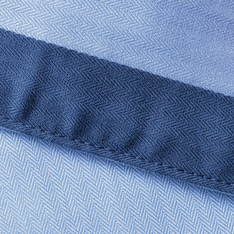 Módní kontrasty: manžety (uvnitř), límec (uvnitř) s kontrastním lemováním, Kontrastní barvy u knoflíkové dírky manžety a spodní knoflíkové dírky. Záševky vzadu pro vytvarovaný střih.