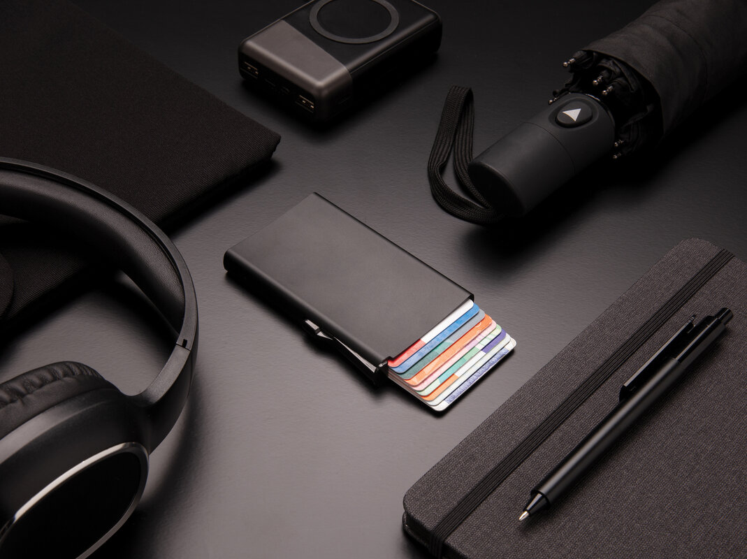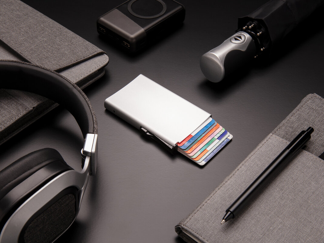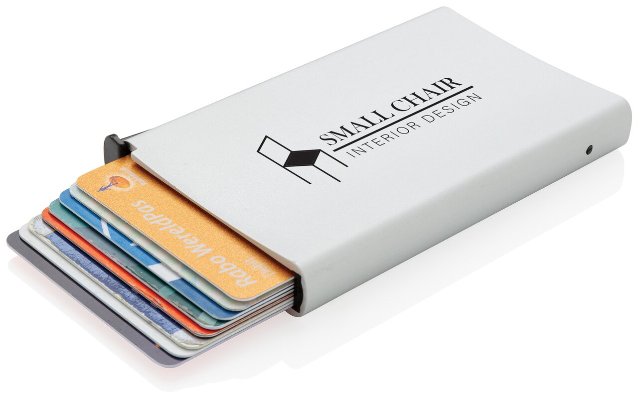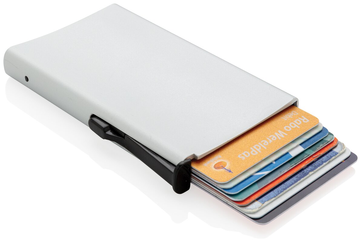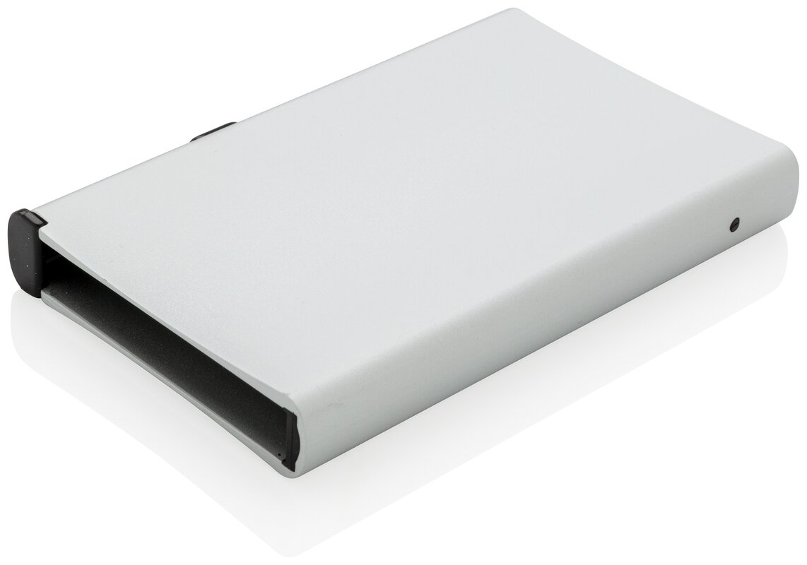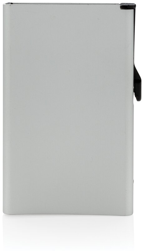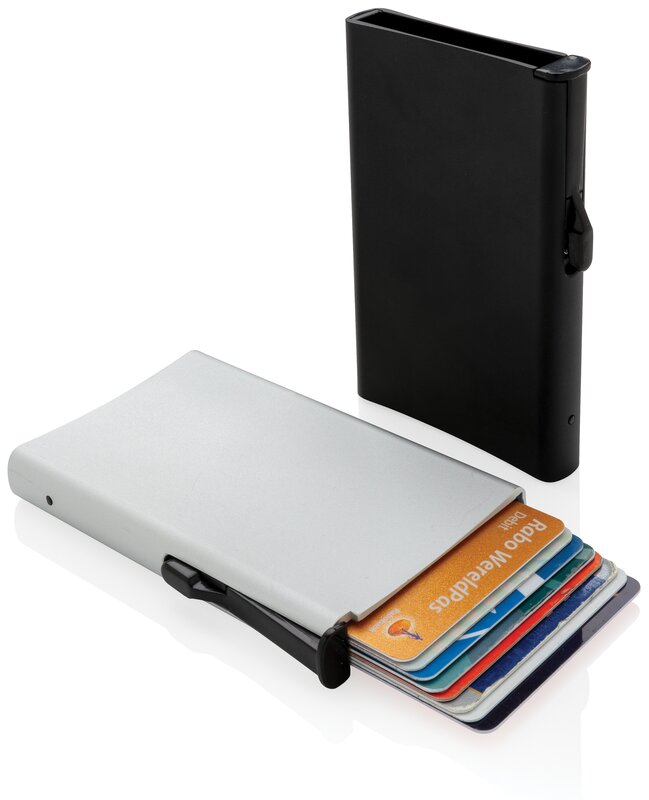 Pevné hliníkové pouzdro na karty, které chrání před skimmingem či fyzickým poškozením. Vejde se do něj až 10 standardních nebo 6 embosovaných karet. Postranní jezdec pro postupné vysunutí všech karet.