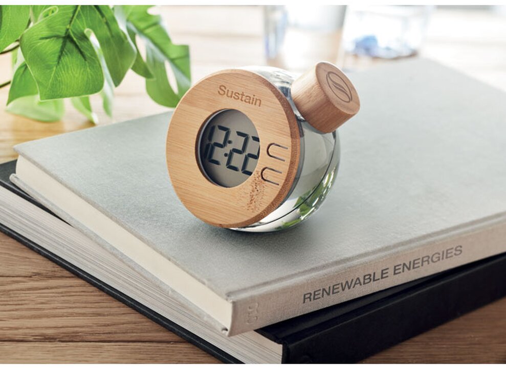 Hodiny s LCD displejem. K nabíjení a napájení tohoto výrobku není potřeba žádná baterie, pouze tekutina (slaná voda). Výrobek má bambusové detaily.