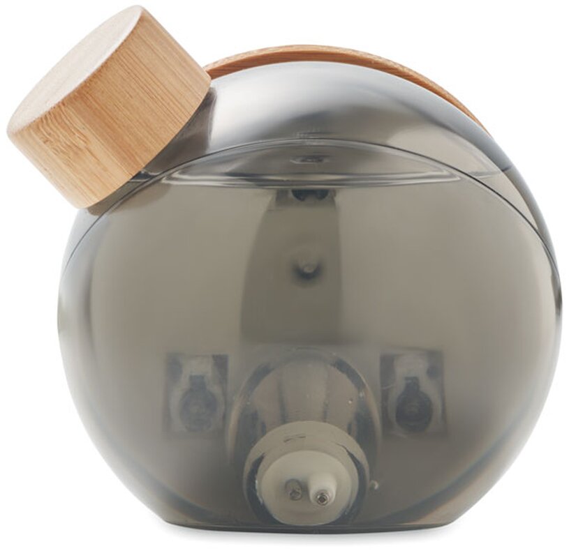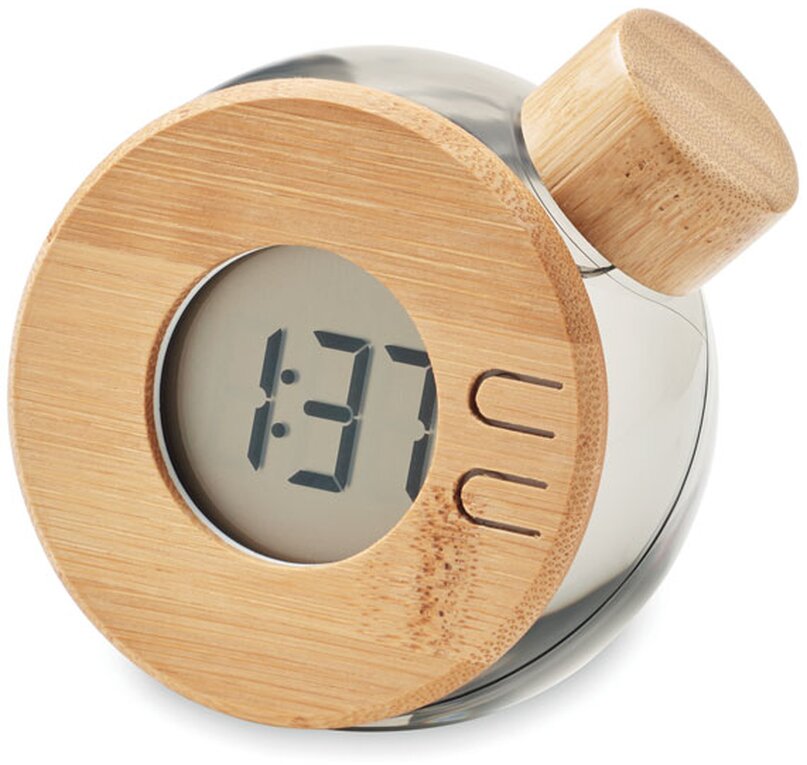 Hodiny s LCD displejem. K nabíjení a napájení tohoto výrobku není potřeba žádná baterie, pouze tekutina (slaná voda). Výrobek má bambusové detaily.