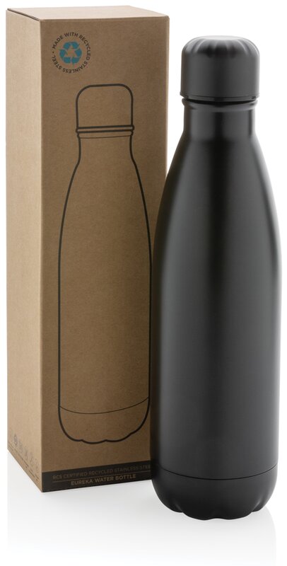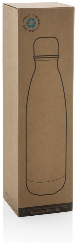 Lahev na vodu Eureka vhodná pro studené nápoje. Průměr spodní části pasuje do většiny stojanů na lahve. Vyrobená z RCS recyklovaných materiálů. RCS (Recycled Claim Standard) je globální standard, který umožňuje ověřit použití recyklovaného materiálu v produktu napříč celým dodavatelským řetězcem. Celkový podíl recyklátu dle váhy produktu: 84 %. Objem: 500 ml. Bez BPA. Baleno v FSC® kraftové dárkové krabičce.