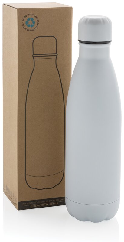Lahev na vodu Eureka vhodná pro studené nápoje. Průměr spodní části pasuje do většiny stojanů na lahve. Vyrobená z RCS recyklovaných materiálů. RCS (Recycled Claim Standard) je globální standard, který umožňuje ověřit použití recyklovaného materiálu v produktu napříč celým dodavatelským řetězcem. Celkový podíl recyklátu dle váhy produktu: 84 %. Objem: 500 ml. Bez BPA. Baleno v FSC® kraftové dárkové krabičce.