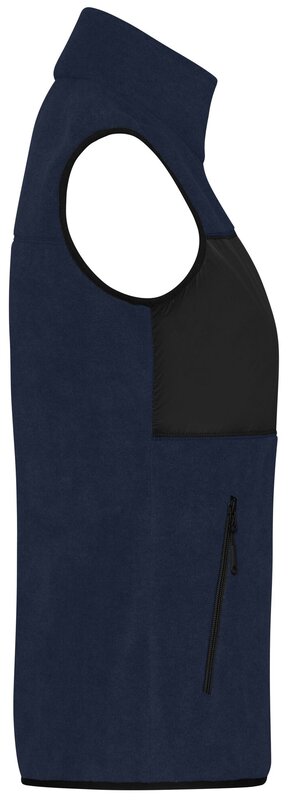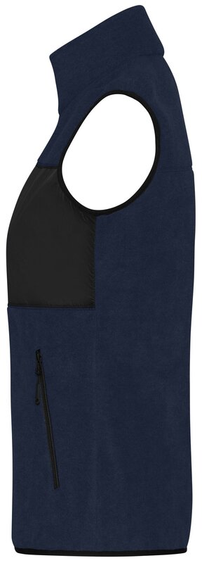 Fleecová vesta s mixem materiálů - polyester fleece, hladký polyester - pro možnost tisku loga. Klasický měkký a snadno udržovatelný fleece z recyklovaného polyesteru. Vsadka s tkané látky s náprsní kapsou. 2 boční kapsy, 1 náprsní kapsa na zip. Uvnitř dvě kapsy. Dvoucestný zip. Kvalitní značkové zipy - YKK