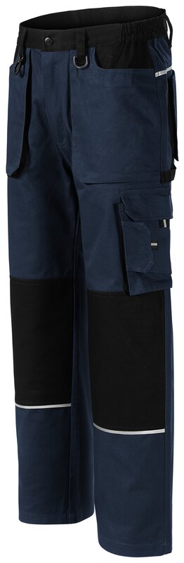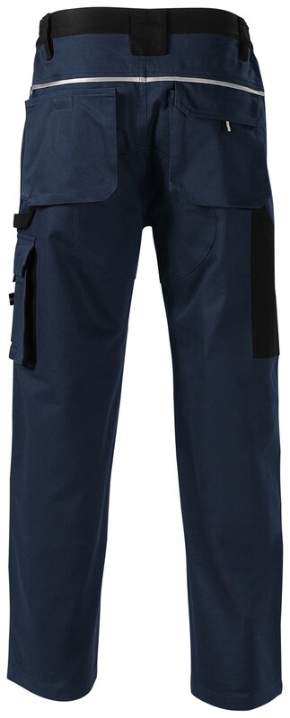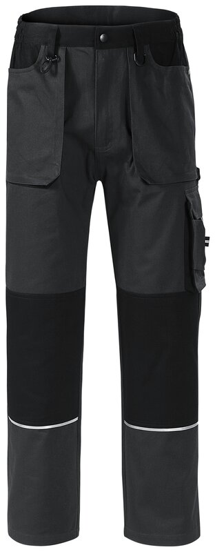 Pánské pracovní montérky s retroreflexní páskou na předním i zadním dílu. Multifunkční kapsy. Pruženka v boční části pasového límce kalhot. Zdvojená kolena a sedová část pro zvýšení odolnosti. Poutko na kladivo.
