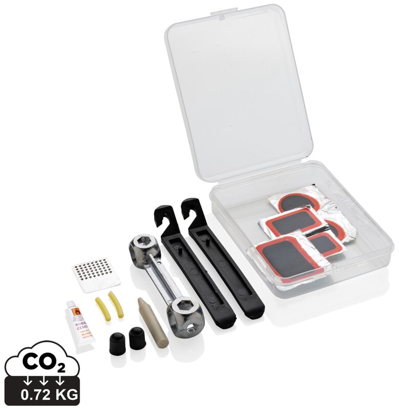 14ks Sada na opravu kola v kompaktní krabičce z plastového PP plastu. Sada obsahuje: 1 klíč ze slitiny hliníku, 2 montpáky, 2 čepičky na ventily, 2 ventilové trubičky, 1 lepidlo, 1 pilník a 5 lepících záplat.