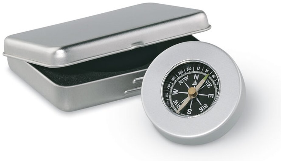 Klasický hliníkový námořní kompas v kovovém pouzdře.