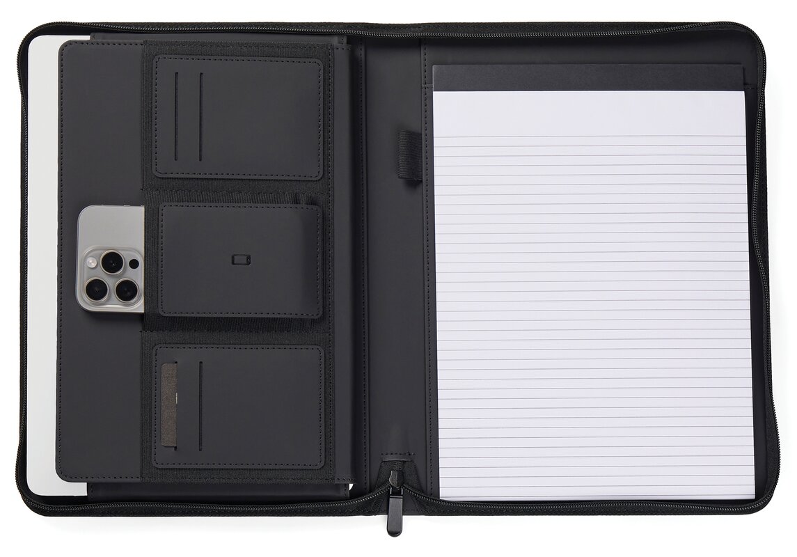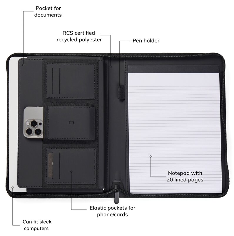 Elegantní konferenční desky velikosti A4 jsou vybaveny držákem na pero, kapsou na papír, kapsami na karty, telefon a poznámkovým blokem s 20 linkovanými stránkami. Toto portfolio je vyrobeno z částečně recyklovaného polyesteru s klasickým matným PU povrchem Baltimore a je ideálním doplňkem na váš pracovní stůl nebo na cesty. Papírová vložka je vyměnitelná. Certifikace RCS zaručuje, že celý dodavatelský řetězec recyklovaných materiálů je certifikován. Celkový obsah recyklovaných materiálů se odvíjí od celkové hmotnosti výrobku. Tento výrobek obsahuje 6 % recyklovaného polyesteru s certifikací RCS.