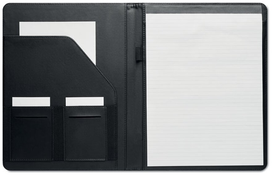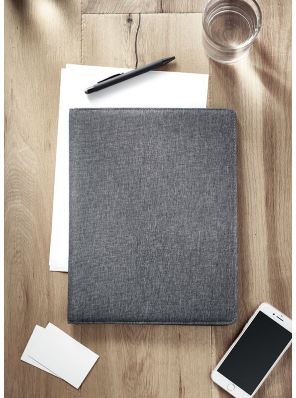 Desky o velikosti A4 z dvoubarevného materiálu 300D RPET. Obsahuje vnitřní přihrádky a poutko na pero. Včetně linkovaného poznámkového bloku na 20 listů. Desky jsou vyrobeny z recyklovaného PET materiálu.