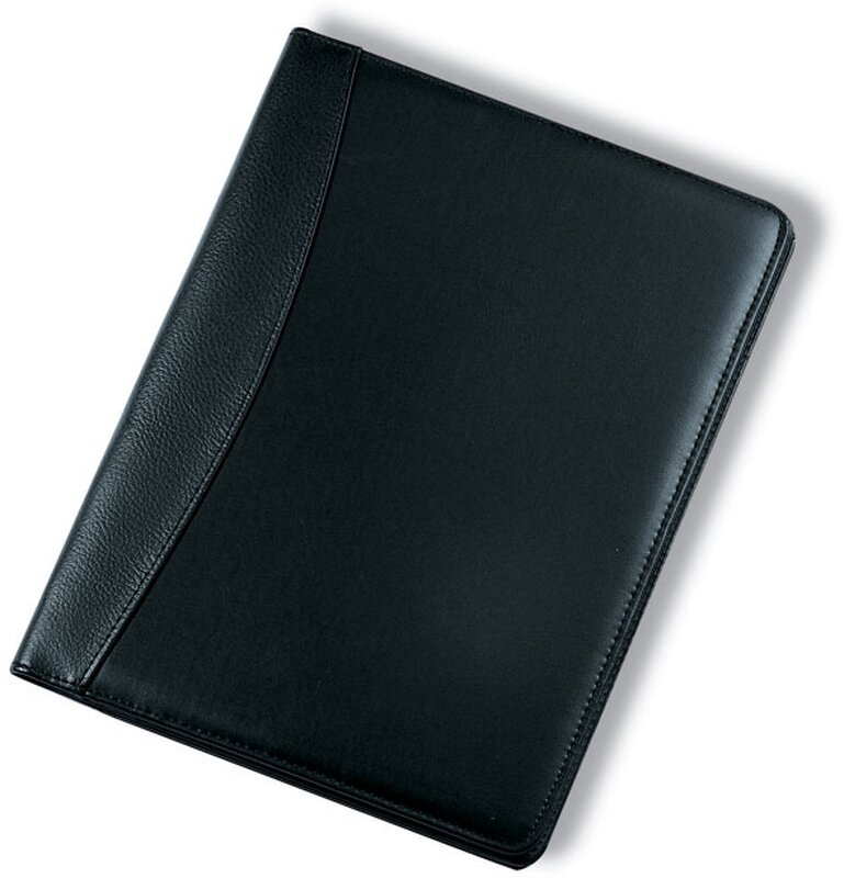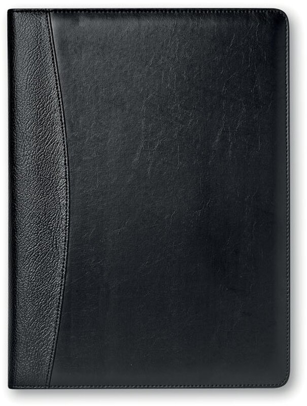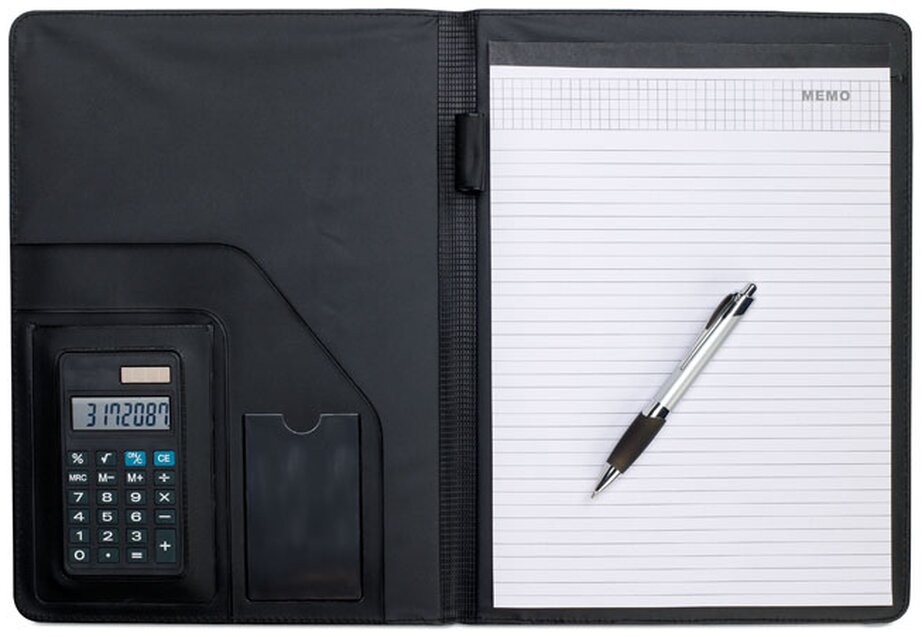 Koženkové konferenční desky A4 s kalkulačkou a poznámkovým blokem, 20 linkovaných stránek. Kovové pero s modrým inkoustem.