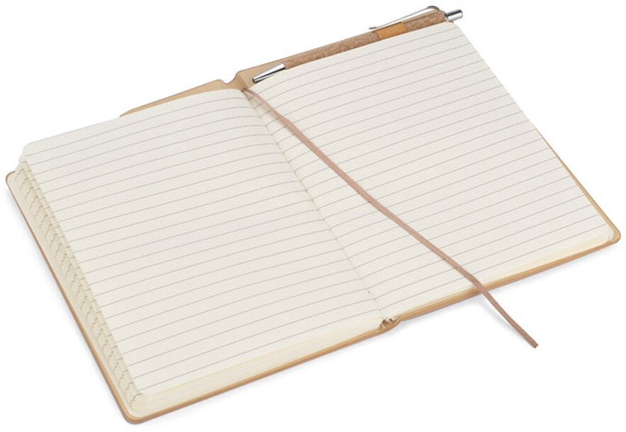 Zápisník TESSO v ekologickém obalu z přírodního korku. Zápisník je dodáván s perem s modrou náplní. Tělo propisky je rovněž vyrobeno z korku, který vytváří ucelený celek. Je umístěn na speciálně profilovaném místě. Formát sešitu A5, 70 linkovaných listů.