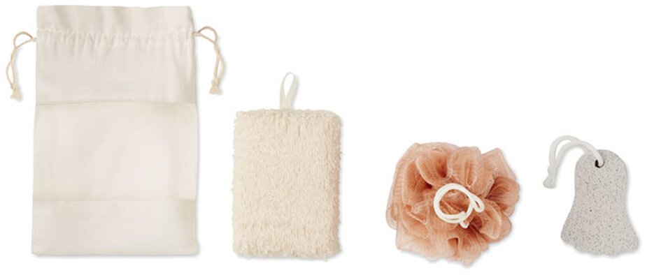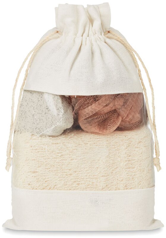 Koupelnová souprava houby, pemzy a žínky zabalená v jutové tašce s okénkem z PEVA. Tato sada se dobře hodí na cesty.