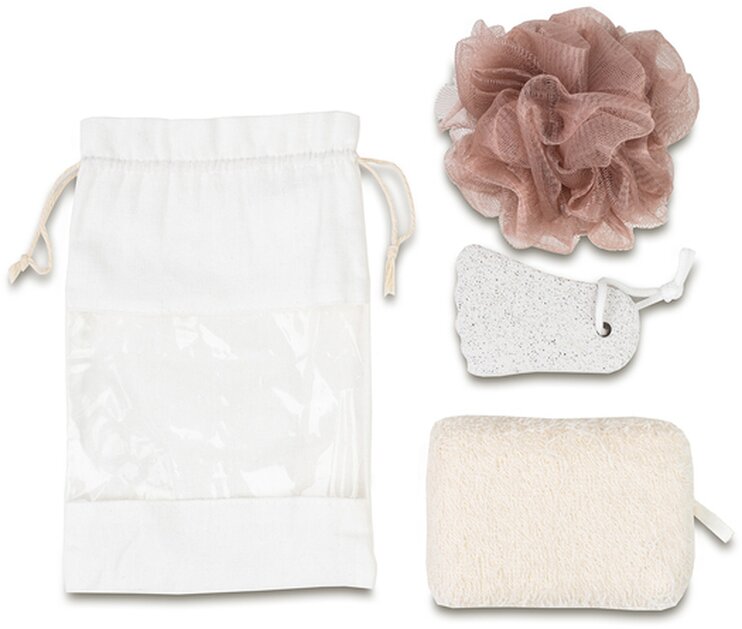 Koupelová sada WELLNESS, která obsahuje žinku, pemzu a houbu na mytí. Celá sada je dodávaná v bavlněné tašce.