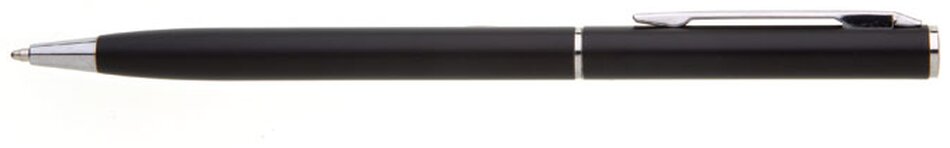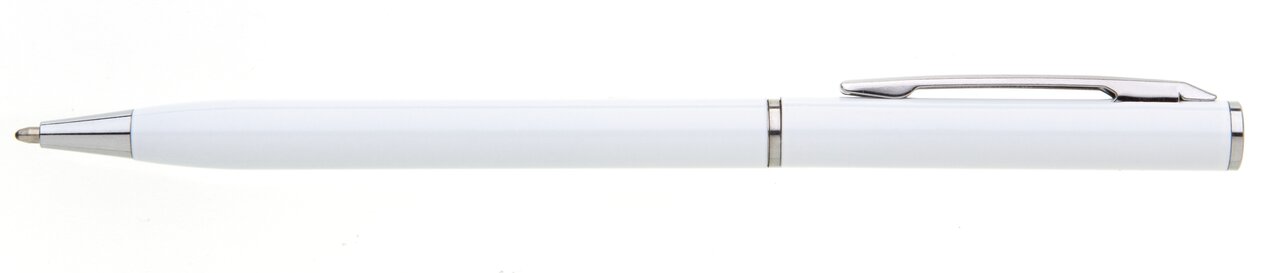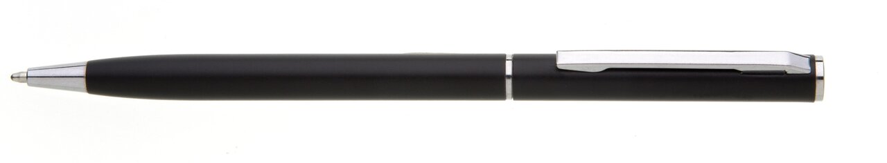Tenká propiska s otočným mechanismem o rozměrech 130x 8 mm. Materiál hliník, náplň modře píšící.