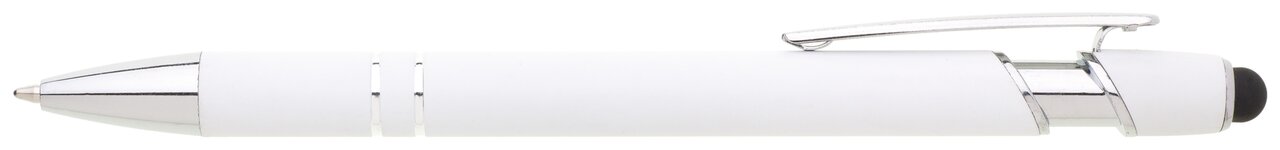 Kovová propiska s koncem touch a měkkým pogumovaným povrchem. Doplňky jsou stříbrné včetně dvou ozdobých kroužků.