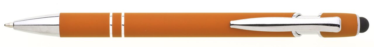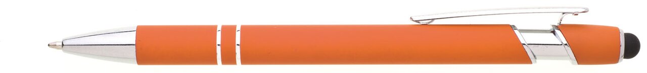 Kovová propiska s koncem touch a měkkým pogumovaným povrchem. Doplňky jsou stříbrné včetně dvou ozdobých kroužků.