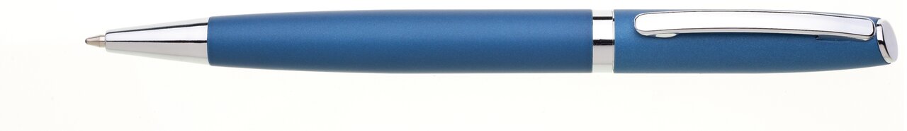 Hliníková propiska TORICO s otočným mechanismem v barvě matně modré a stříbrnými doplňky. Náplň velkoobsahová, modře píšící.