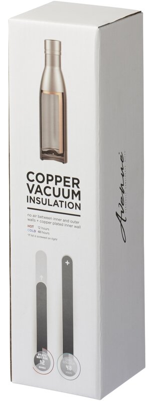 Minimalistická termolahev Vasa s dvojitou stěnou. Vyrobená z nerezové oceli 18/8 s vakuovou izolací a měděnou vnitřní stěnou. Udržujte své nápoje horké po dobu 12 hodin / studené po dobu 48 hodin. Objem 500 ml. Dodáváno v balení (krabička) Avenue.