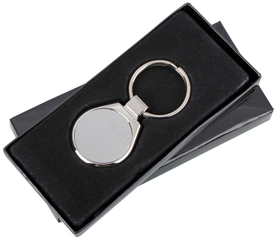 Kovový elegantní přívěsek na klíče v černé dárkové krabičce.