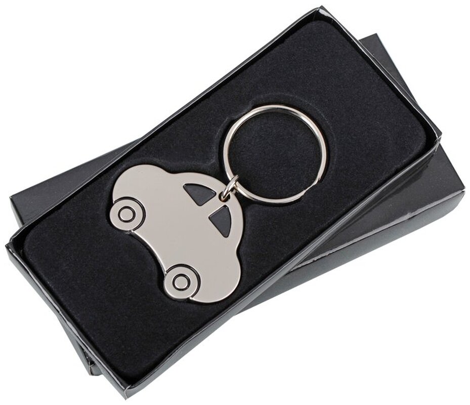 Klíčenka z kovu ve tvaru auta. Součástí je černá dárková krabička o rozměrech 11 x 1,2 x 5 cm.