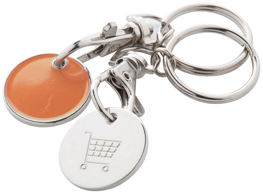 Kovový přívěšek na klíče se žetonem do nákupního košíku.