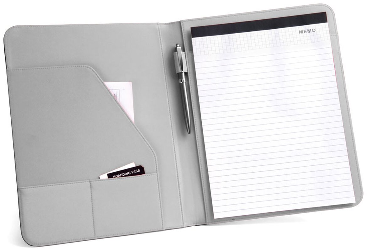 Složka na dokumenty s koženkovými deskami v několika barevných variantách s poutkem na propisku a kapsičkami na vizitky. Vnitřní část je z mikrovlákna.