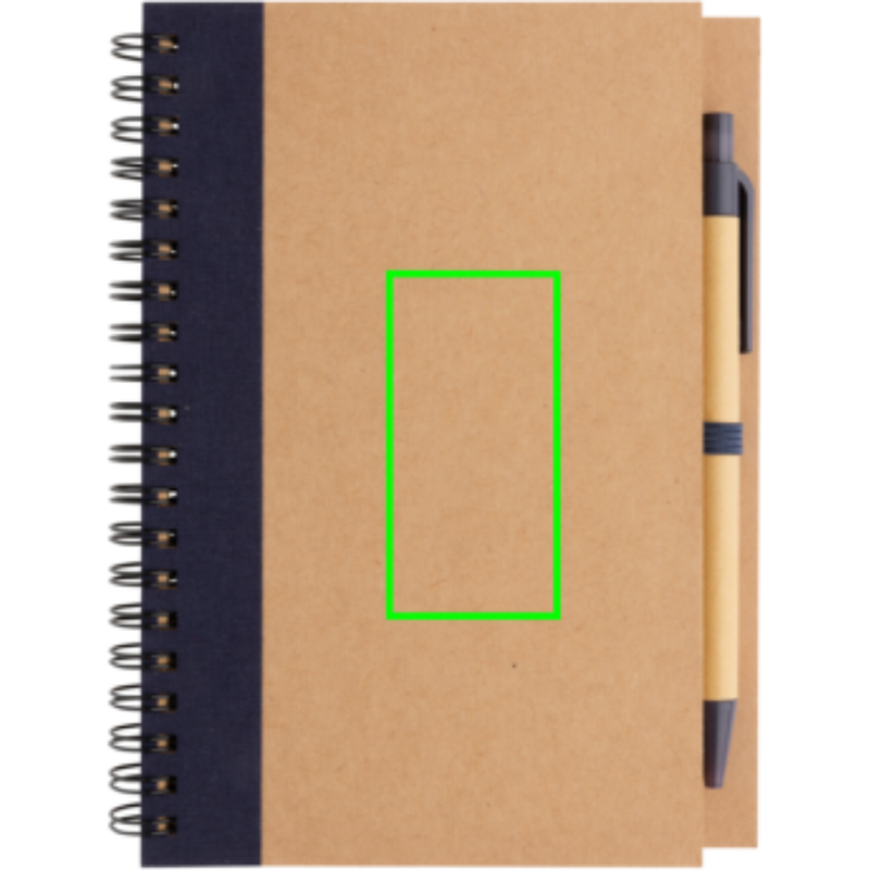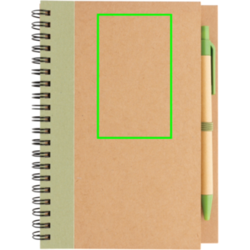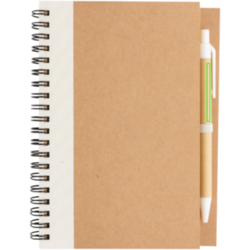 Poznámkový blok s kroužkovou vazbou, obalem z kraftového papíru a s perem. Obsahuje 70 listů/140 stran recyklovaného linkovaného papíru v krémové barvě o gramáži 70 g/m2.