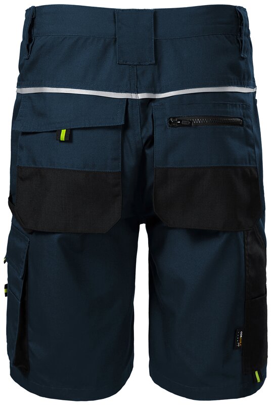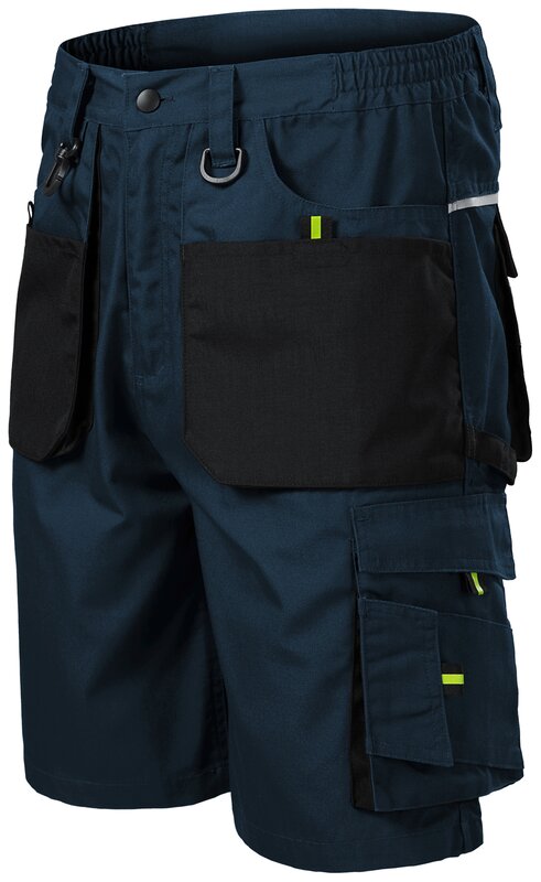 Pánské pracovní montérkové kraťasy s retroreflexní páskou na zadním dílu. Kraťasy mají multifunkční kapsy a pruženku v boční části pasového límce. Na kraťasech je i poutko na kladivo.