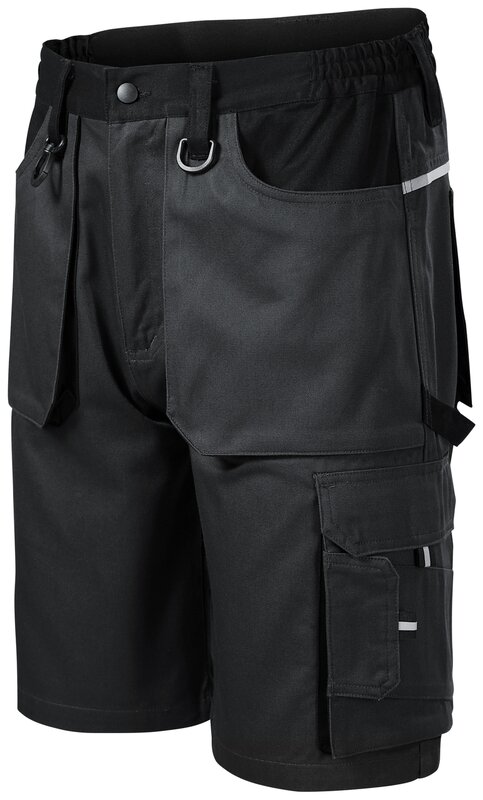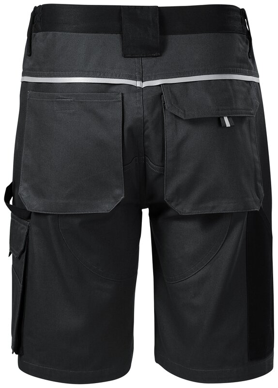 Pánské pracovní montérkové kraťasy s retro reflexní páskou na zadním dílu. Kraťasy mají multifunkční kapsy. Pruženku v boční části pasového límce. Zdvojenou sedovou část pro zvýšení odolnosti a poutko na kladivo.