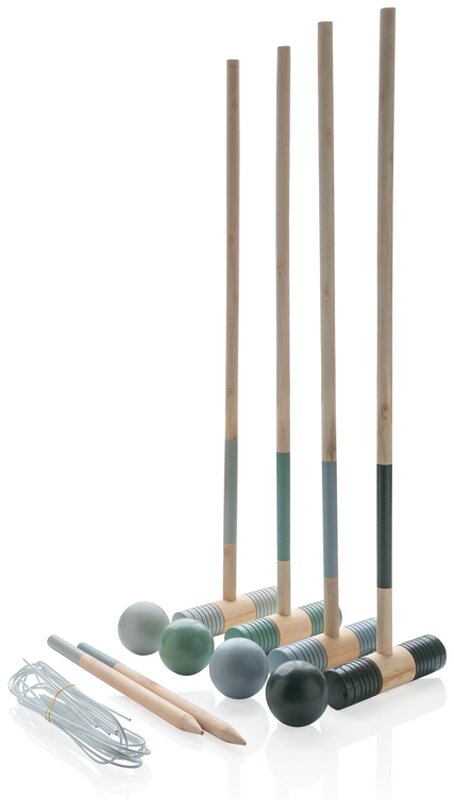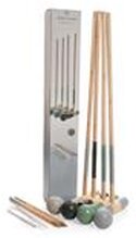 Prémiová sada hry kroket pro 4 hráče. Produkt obsahuje 4 kroketové hole, 4 koule a 10 kovových branek, včetně bavlněného pytlíku a pravidel hry.Hlava hole a koule jsou vyrobeny z borovicového dřeva, madlo hole a kolíky z eukalyptového dřeva.