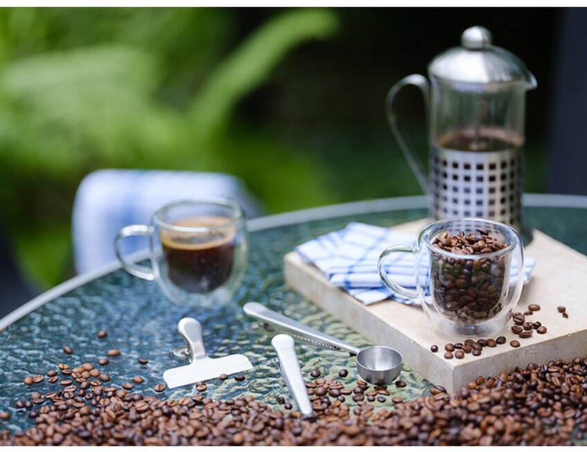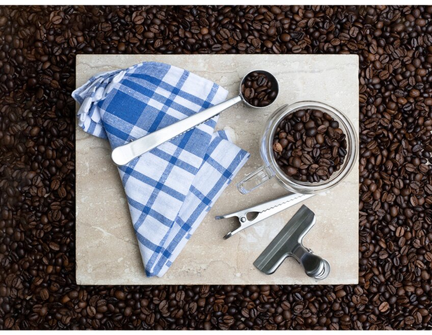 Kuchyňská sada KAFFI z nerezové oceli. Obsahuje odměrku a klipy na uzavírání obalů.