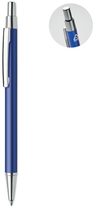 Kuličkové pero, které je vyrobeno z recyklovaného hliníku. Produkt obsahuje modrý inkoust.