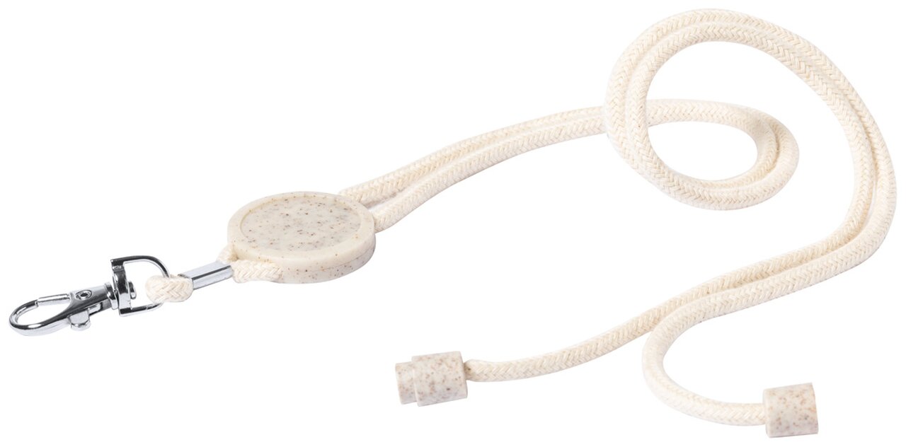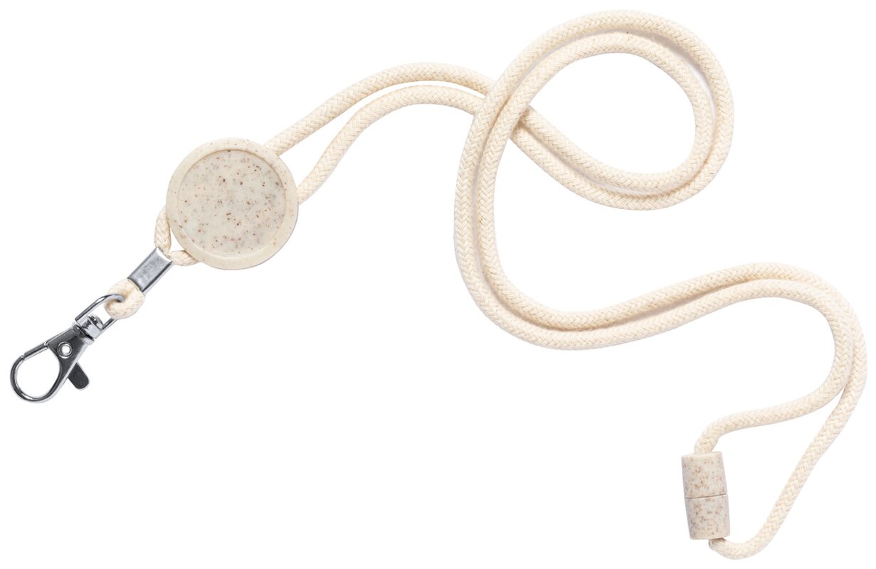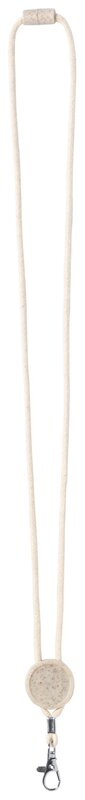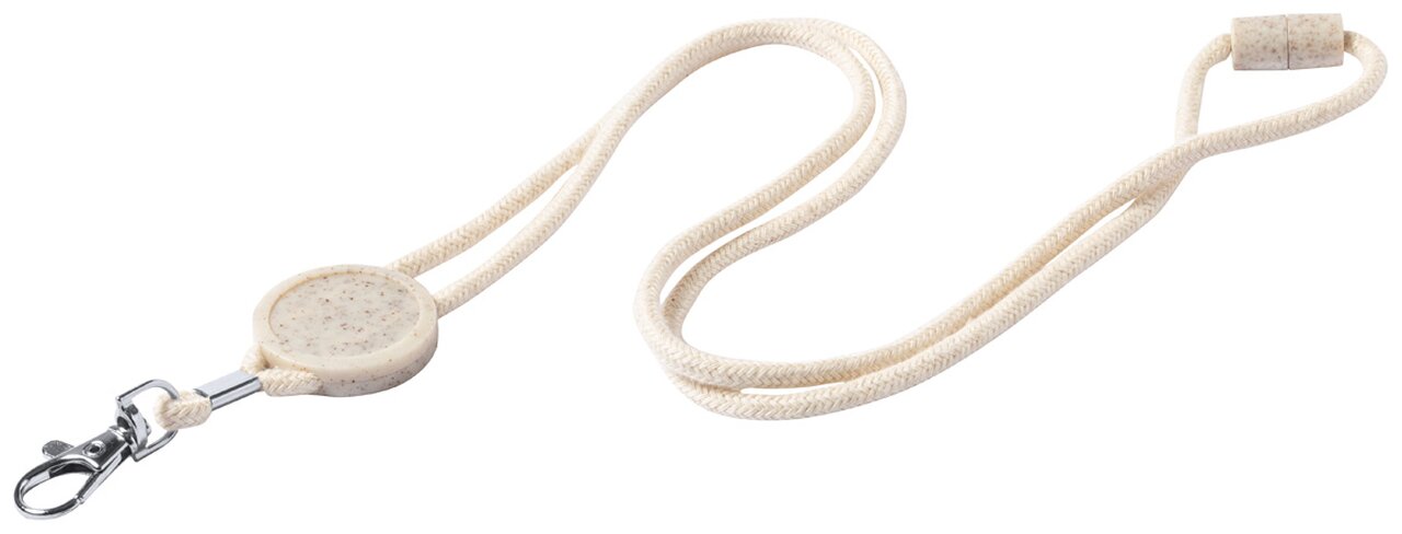 Bavlněný lanyard na krk s kovovou karabinou, bezpečnostní přezkou a kulatým štítkem z ekologické pšeničné slámy a ABS plastu.