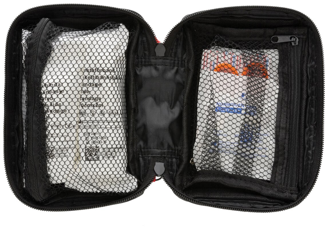 Luxusní lékárnička vyrobená z voděodolné nubukové PU kůže, která je zároveň stylová i praktická. Materiál lze snadno čistit. Obsah: 1ks PBT obvaz, 1ks PBT a kompresní obvaz, 1ks trojúhelníkový obvaz, 1ks sada pro dýchání z úst do úst, 1 pár rukavic, 1ks lepící páska, 3ks špendlíky, 1ks nůžky, 10ks náplastí a 4ks alkoholových polštářků. Obsah je v souladu se směrnicemi pro zdravotnické prostředky: 93/42/EHS a EU (2017/745), EN ISO 13485:2016. Veškerý obsah (kromě špendlíků a nůžek) je zabalený v papírovém sáčku označeném všemi povinnými informacemi, které vyžaduje legislativa EU (datum expirace, CE, číslo šarže). Celkový recyklovaný obsah: 24 % na základě celkové hmotnosti položky. Certifikace RCS zajišťuje kompletně certifikovaný dodavatelský řetězec recyklovaných materiálů.