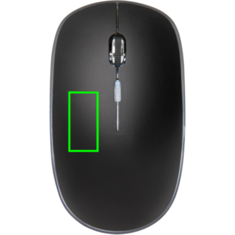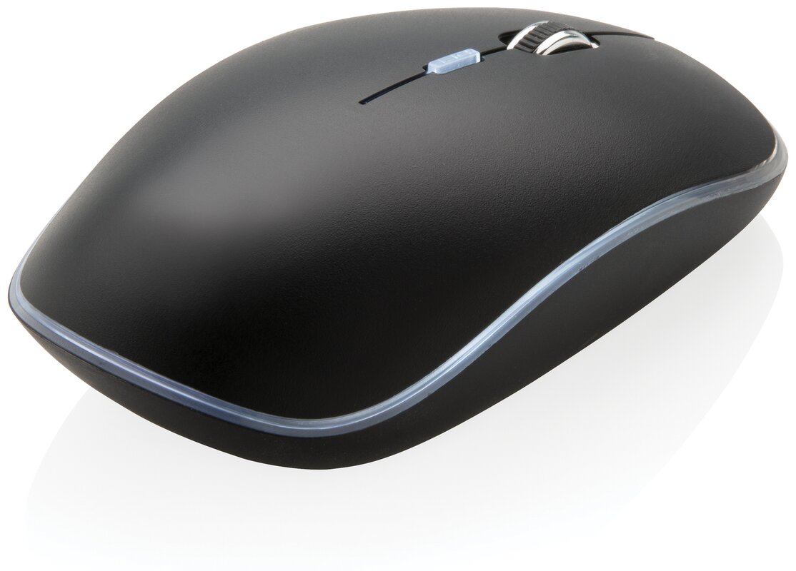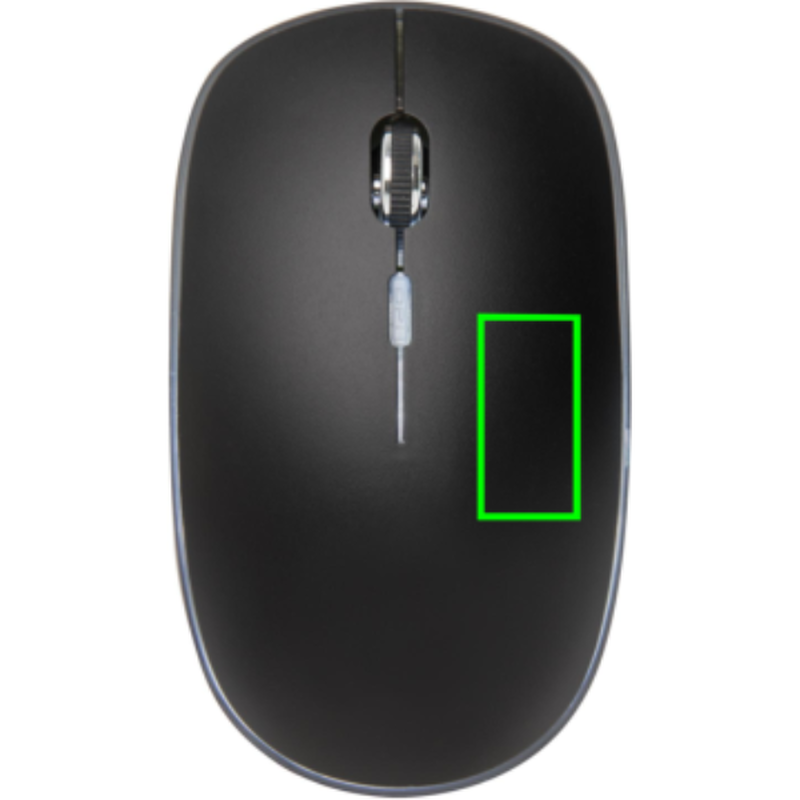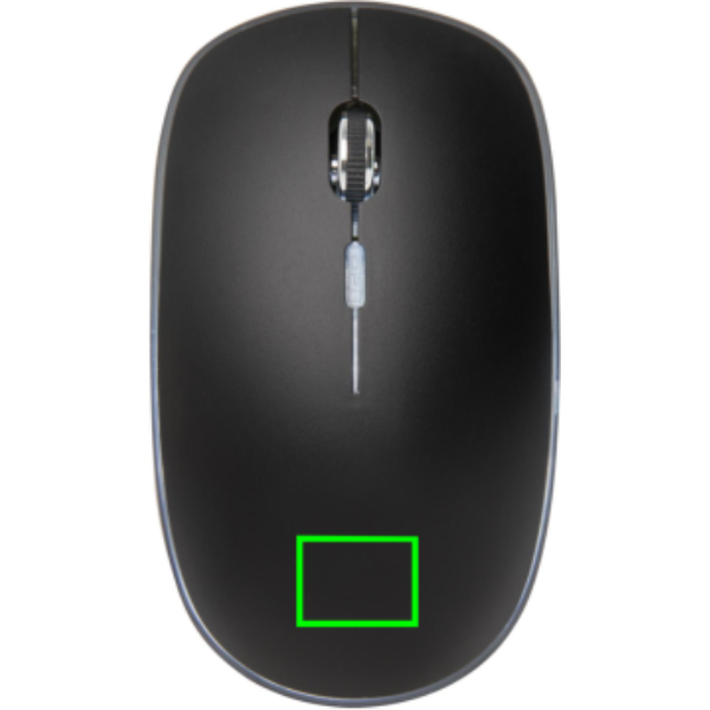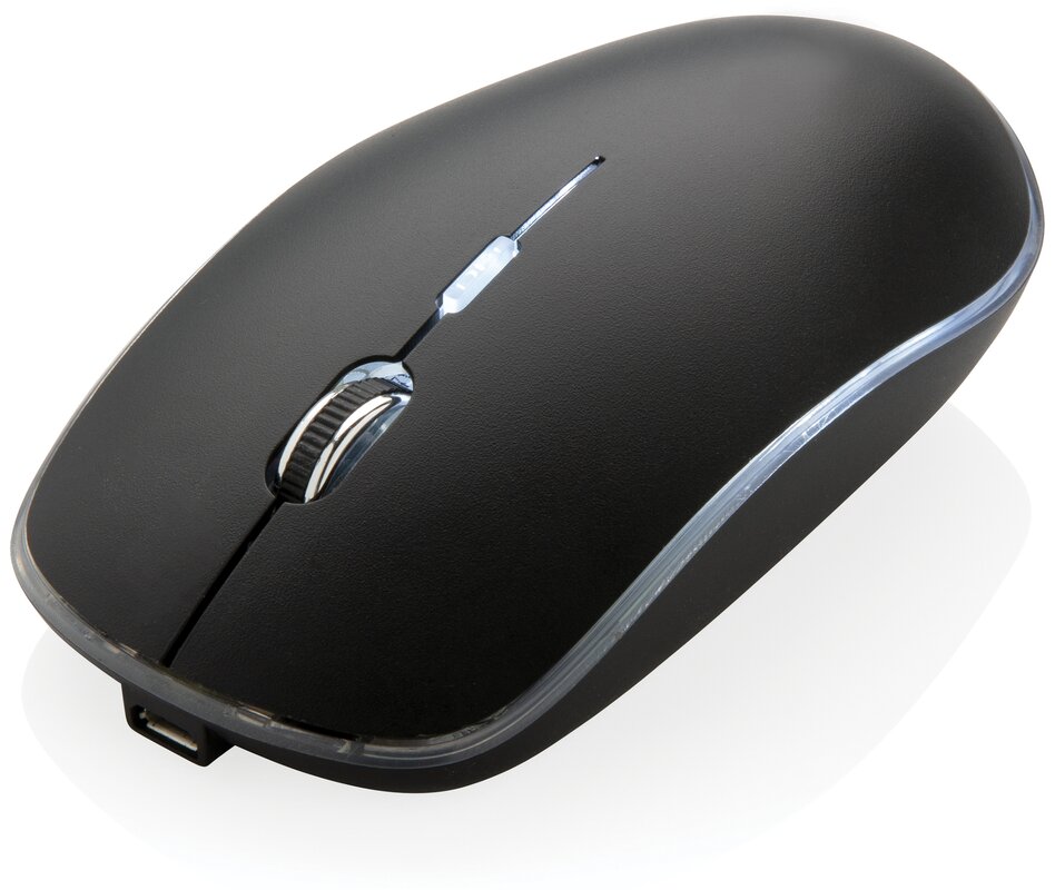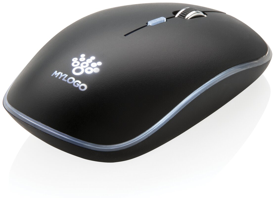 Komfortní bezdrátová myš s možností gravíru loga, jehož vzor se při používání rozsvítí a logo tak efektně zvýrazní. Produkt obsahuje dobíjecí 300 mAh lithium polymerovou baterii, která se plně nabíjí již za 3 hodiny, bezdrátové připojení (125 Hz) zajišťuje USB přijímač, který se snadno instaluje do počítače a levé a pravé klikací tlačítka a prostřední klikací/rolovací kolečko. Citlivost myši je možné přizpůsobovat. Výrobek je kompatibilní se všemi nejnovějšími operačními systémy Windows a Mac.
