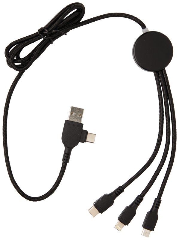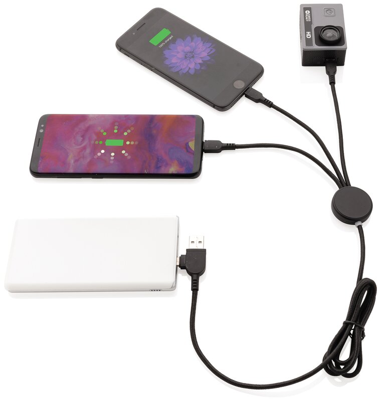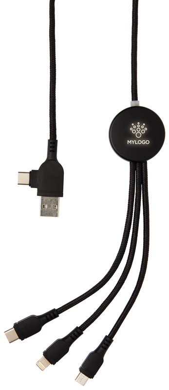 Univerzální nabíjecí kabel s 5 konektory: USB C/USB A vstup, USB C/micro USB/iOS výstup. USB C je vhodné pro nabíjení moderních telefonů, ale i MacBooků. USB A má dvojí funkci (vstup i výstup) pro nabíjení jakéhokoliv zařízení z jakéhokoliv jiného zdroje. Pouzdro na kabel je vyrobeno z ABS s prostorem na gravír loga, které se při používání osvětlí. Produkt je bez PVC.