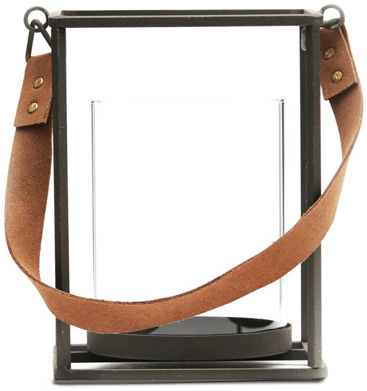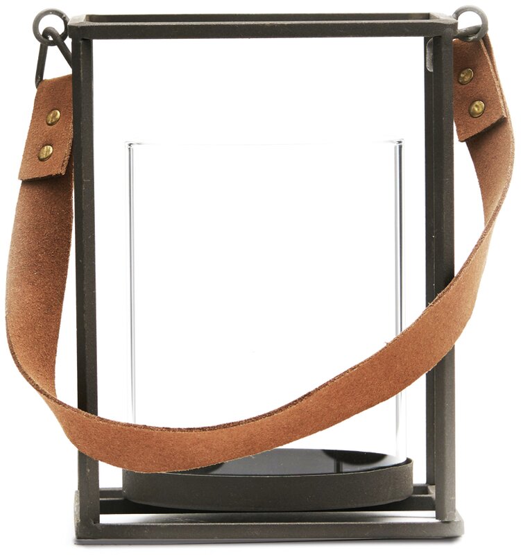 Rukojeť z měkké imitace kůže, jednoduché ocelové profily a skleněný válec.